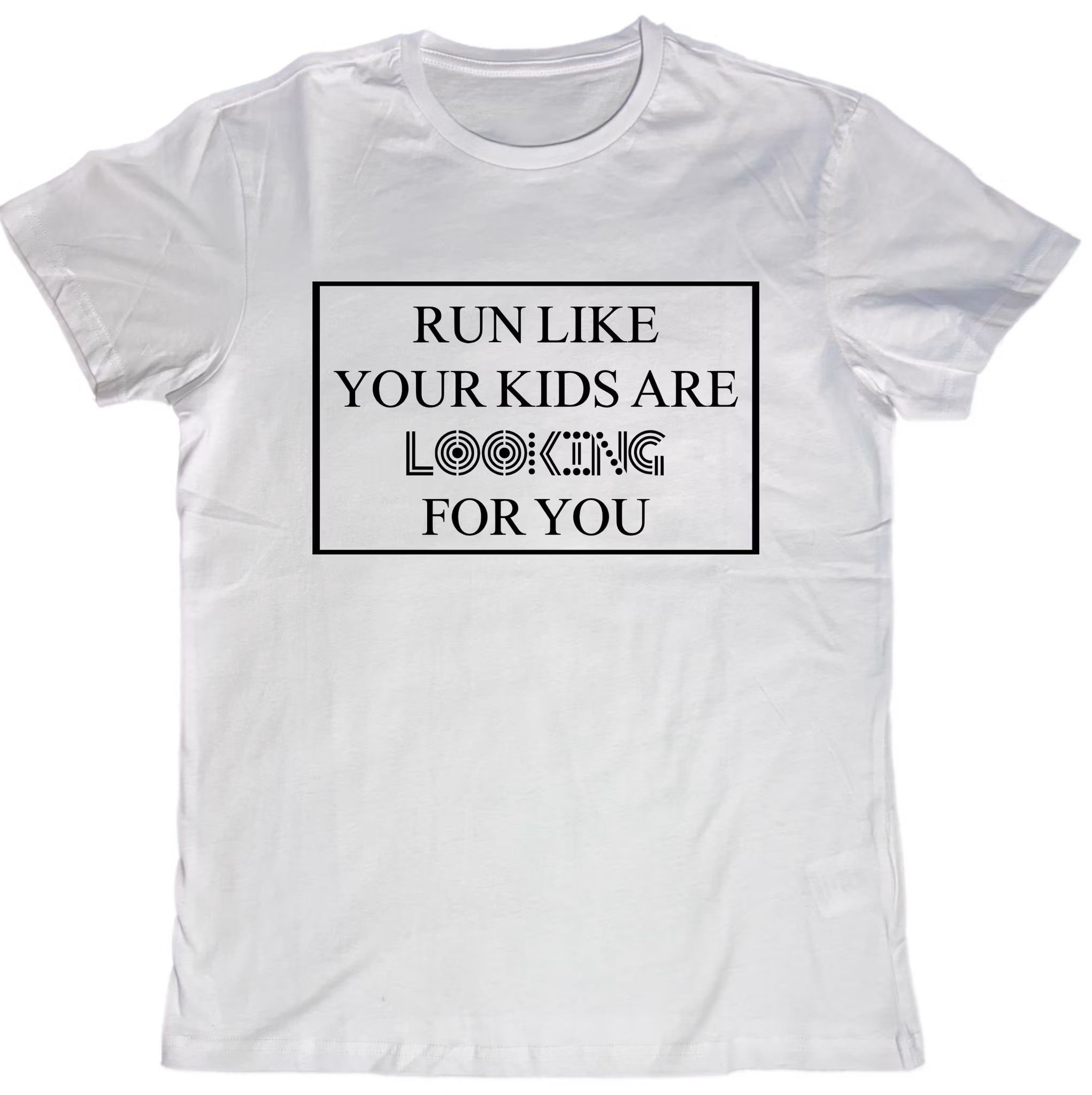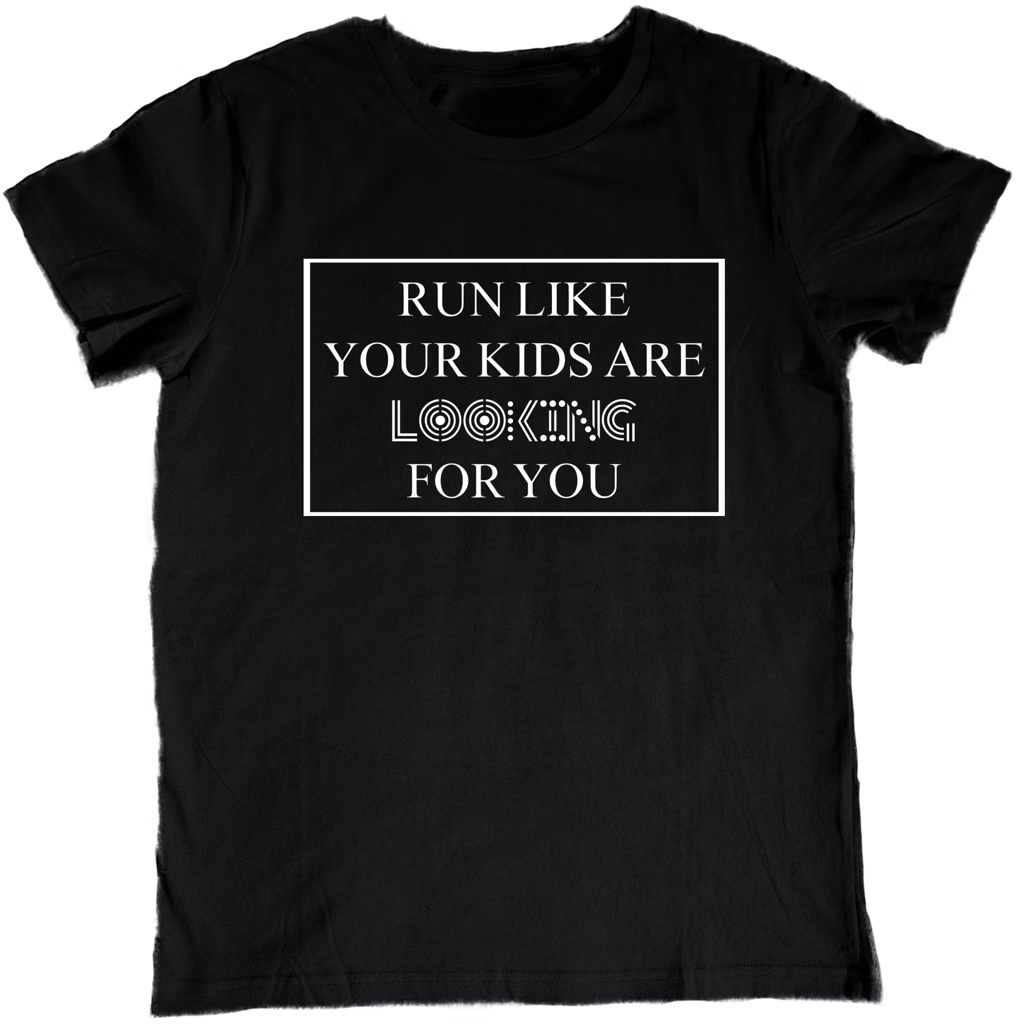 Den ultimata motivationen – ren överlevnadsinstinkt! Den här t-shirten med trycket 'Run like your kids are looking for you' är perfekt för dig som vet att föräldraskap ibland kräver snabba fötter och strategiska gömställen. Gjord av 100% bomull, så du kan vara bekväm både när du faktiskt springer och när du bara låtsas att du inte hör ordet 'Mamma/Pappa' ropas för femtioelfte gången. Perfekt för föräldrar med humor och en välutvecklad flyktplan!