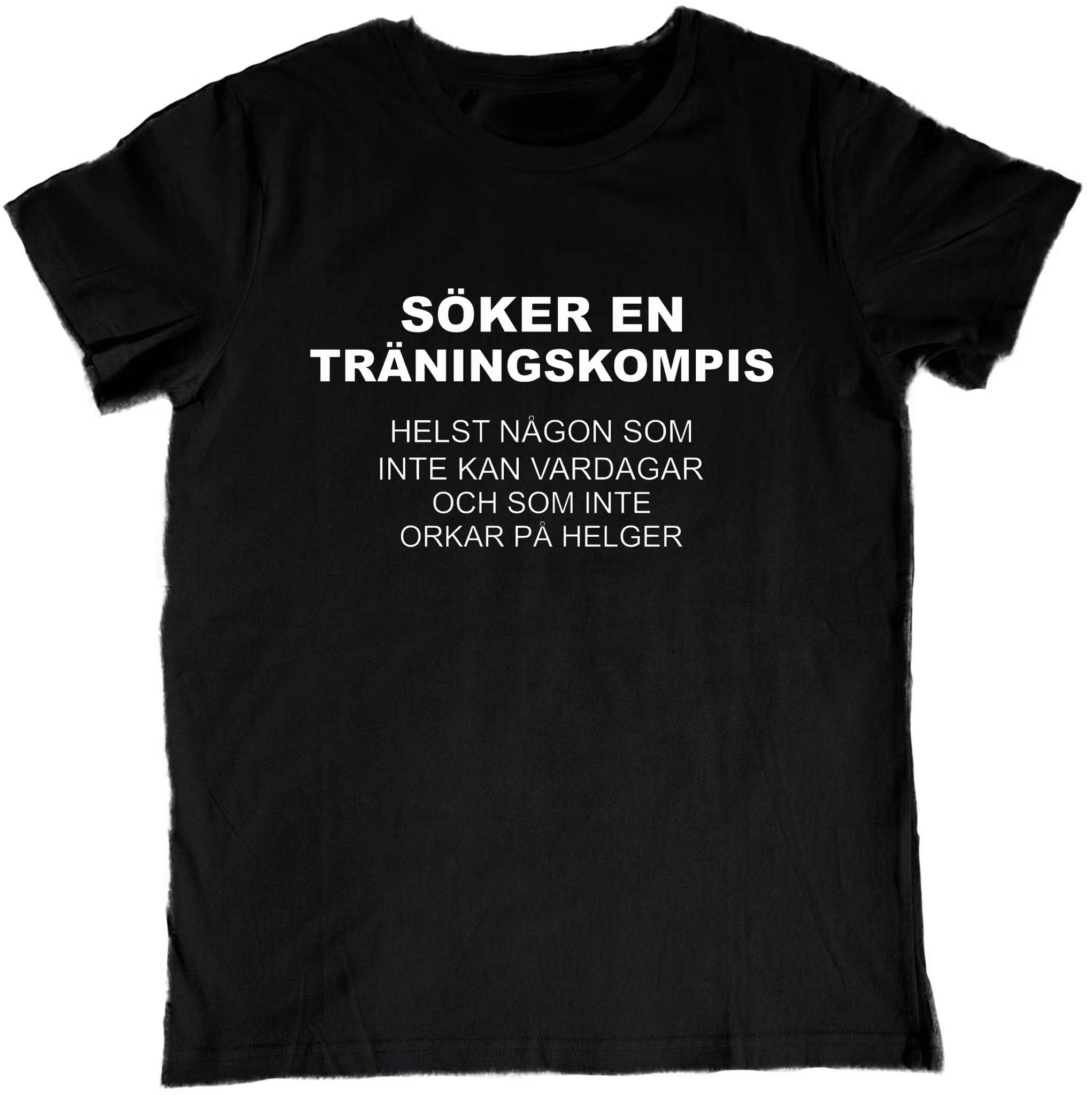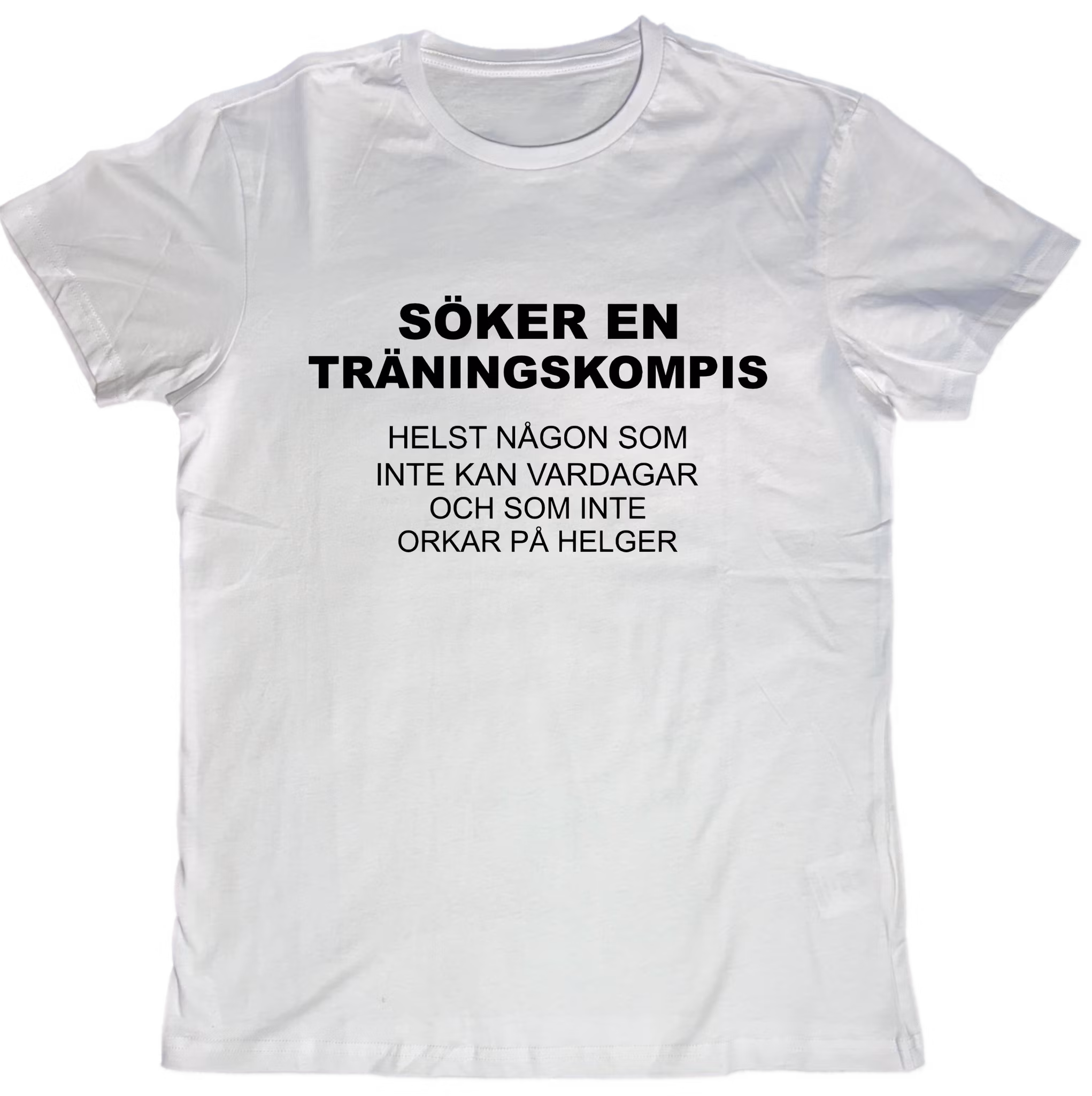 Den ultimata träningsplanen: maximera vilodagar och minimera ansträngning! Den här t-shirten med trycket 'Söker en träningskompis, helst någon som inte kan vardagar och som inte orkar på helger' är perfekt för dig som vill ha en aktiv livsstil – i teorin. För dig som mästerligt undviker gymmet, men gärna snackar om träning över en fika. Tillverkad i 100% bomull, så du kan vara bekväm medan du fortsätter att skjuta upp träningsstarten till 'nästa vecka'!