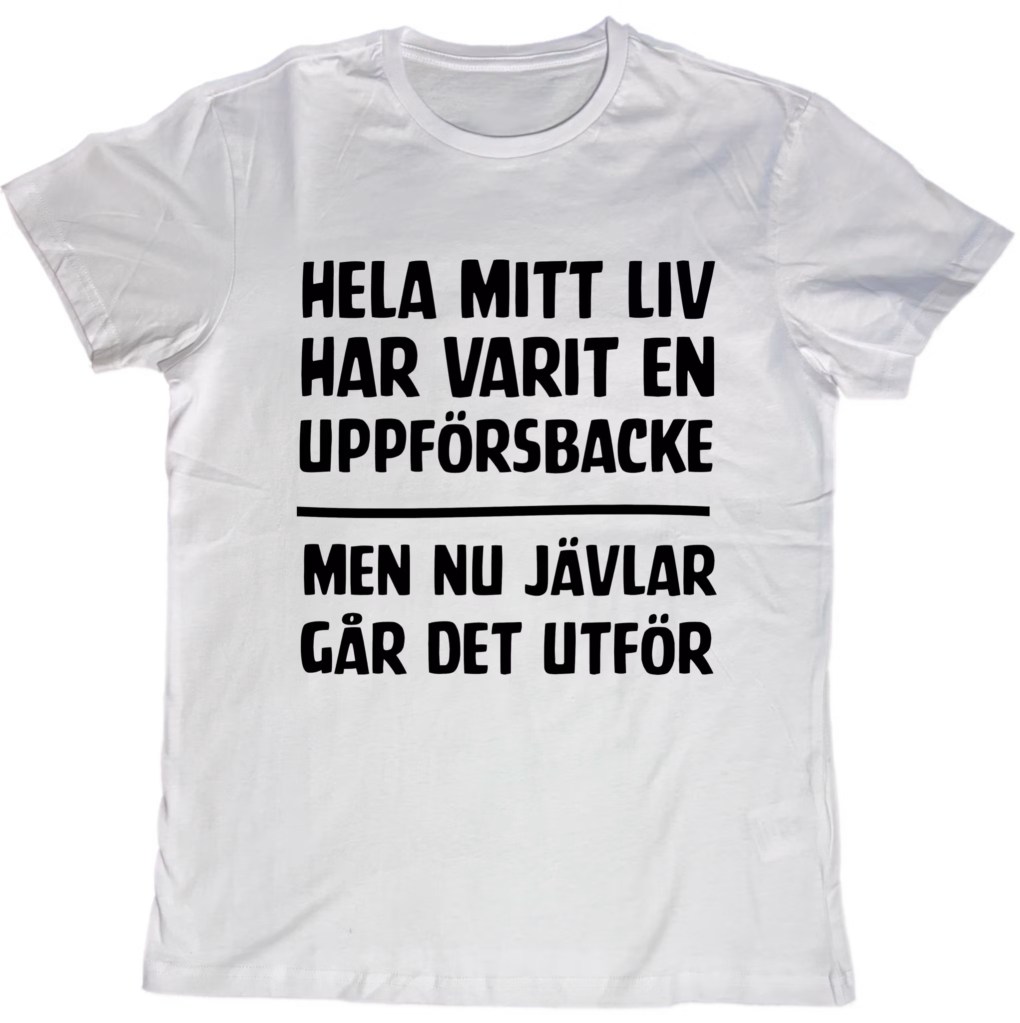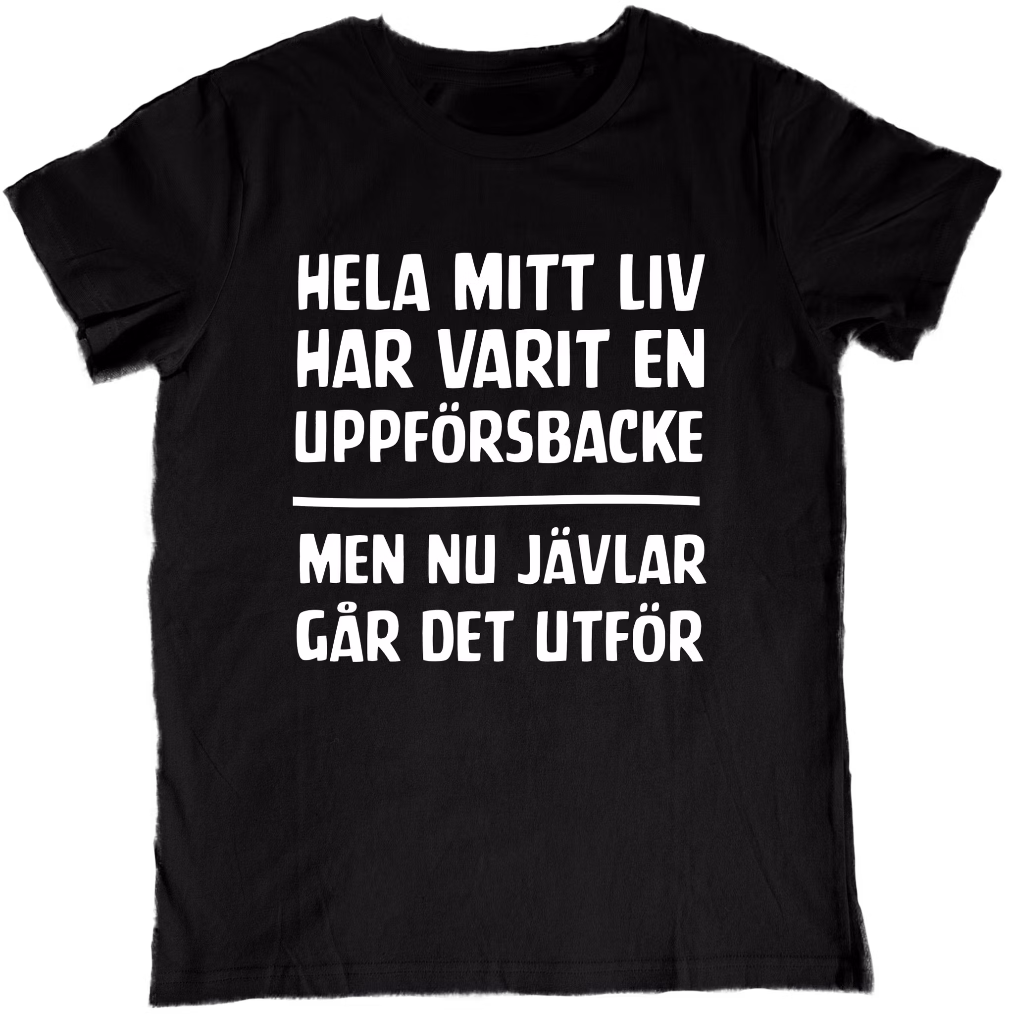 Med det humoristiska trycket 'Hela mitt liv har varit en uppförsbacke men nu jävlar går det utför' sprider denna t-shirt både skratt och reflektioner.