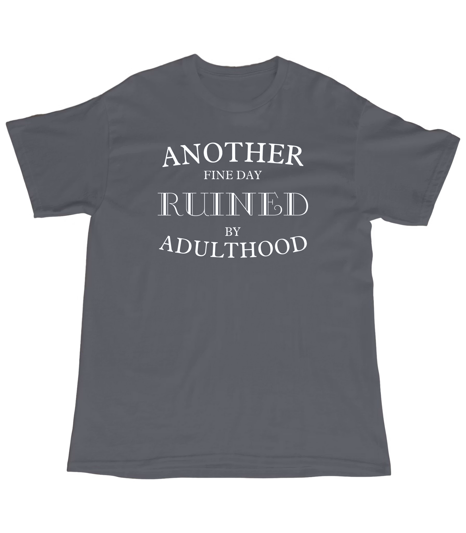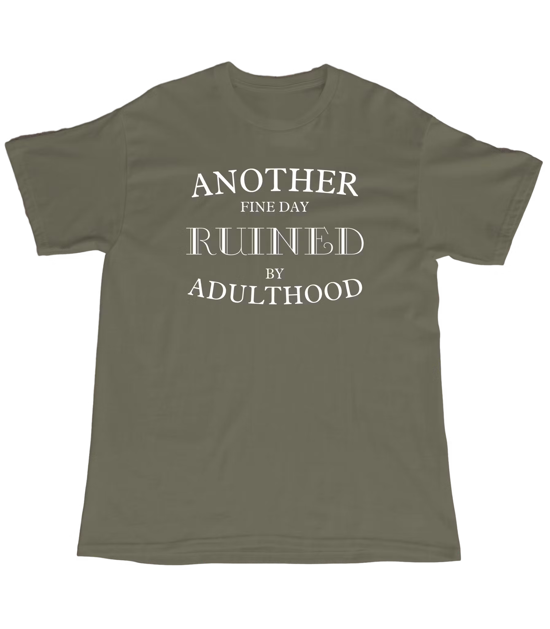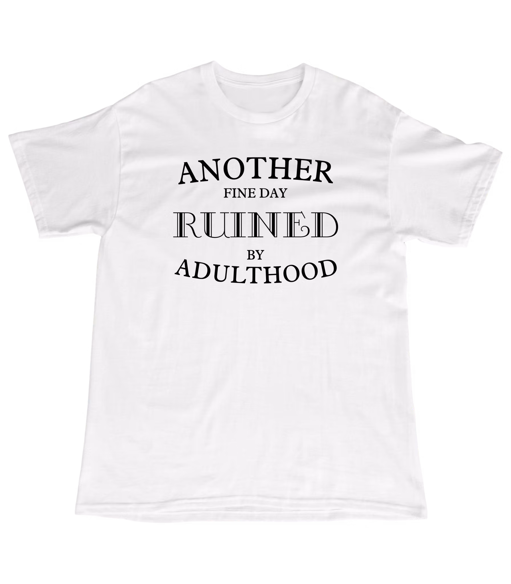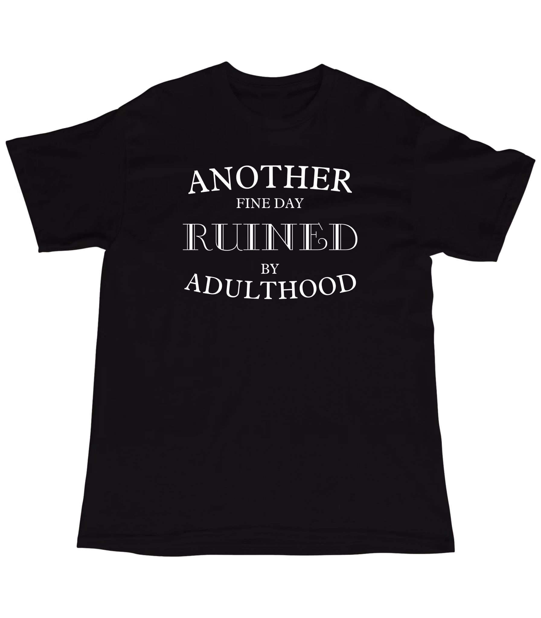 För dig som vet att vuxenlivet är en konstant kamp mellan ansvar och längtan efter att bara ligga på soffan – den här t-shirten med trycket 'Another Fine Day Ruined by Adulthood' är din perfekta följeslagare. Gjord av 100% bomull, erbjuder den både komfort och en chans att sprida skratt och igenkänning.