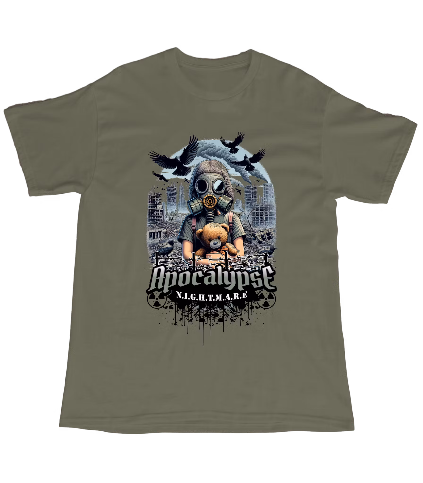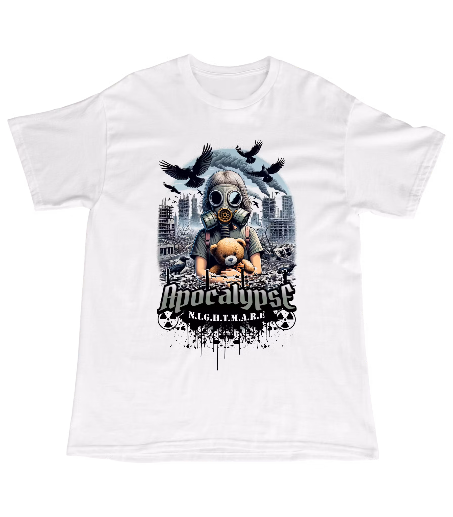 Motivet med gasmasken, nallen och ruinerna säger allt: hopp och mörker i perfekt kontrast.