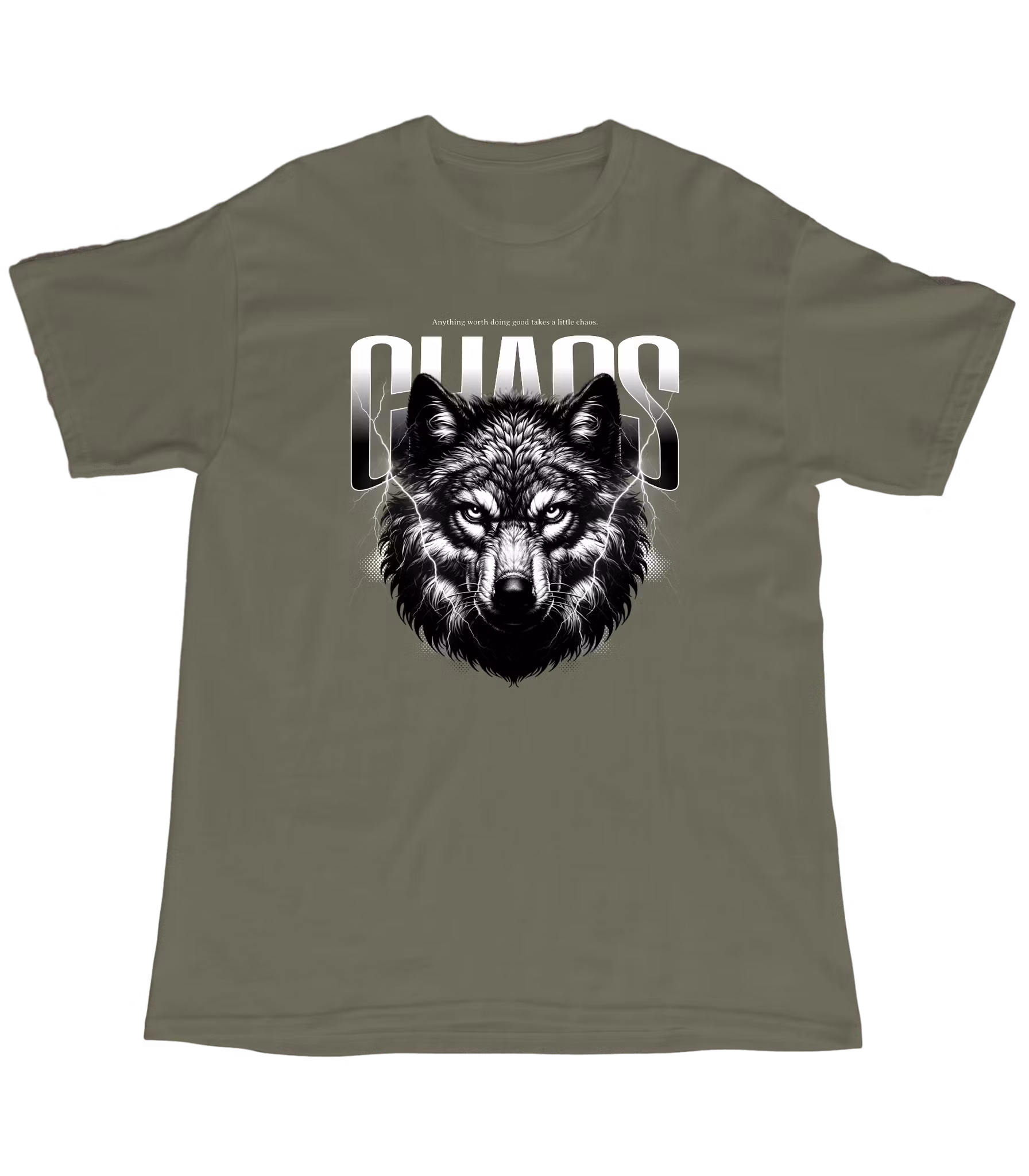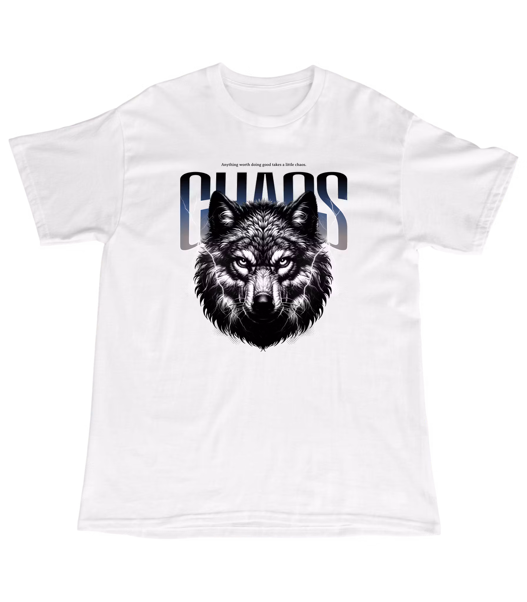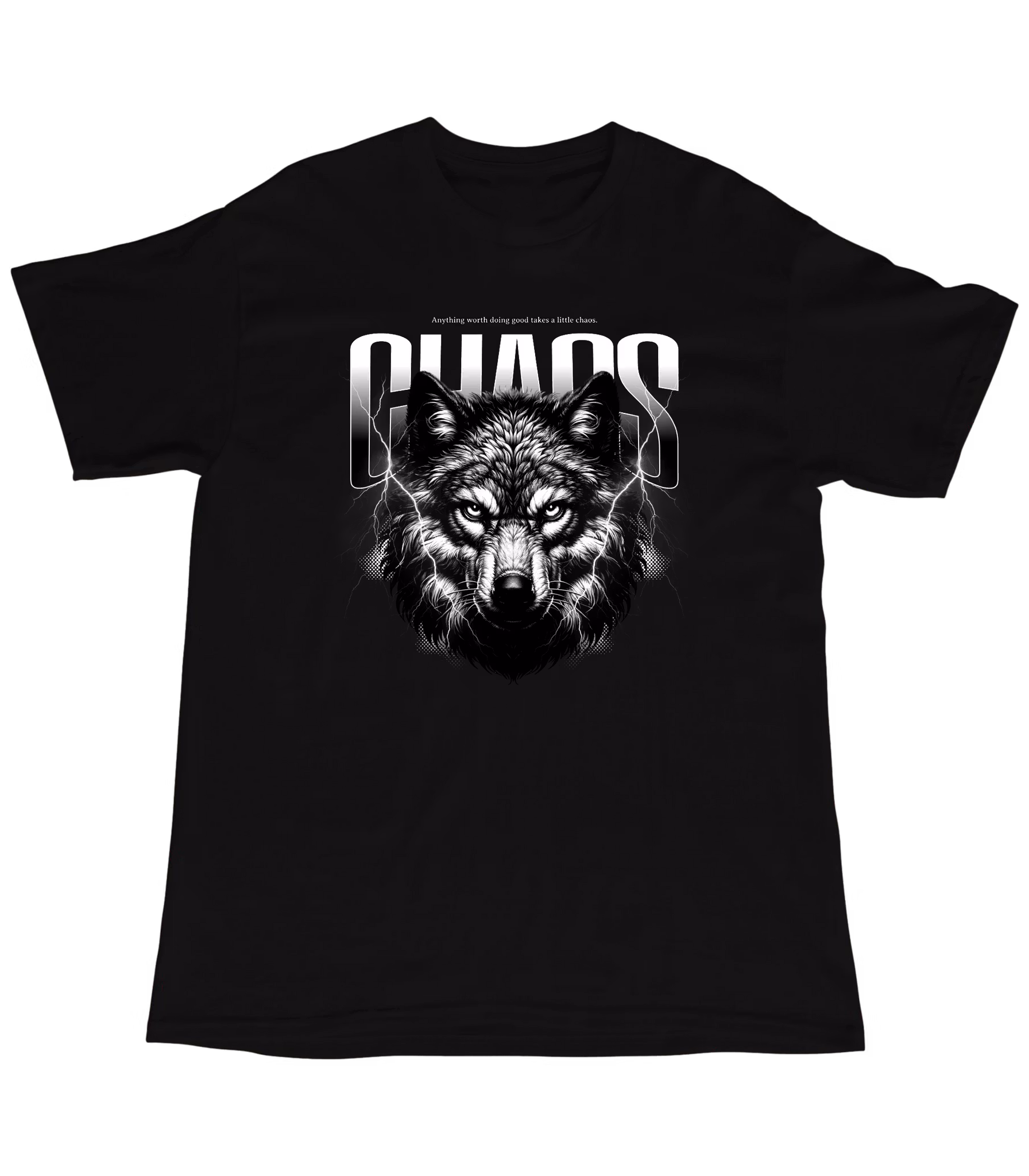 Motivet med den svarta vargen och det stora CHAOS-trycket säger allt: du är inte rädd för att gå din egen väg – även om den är lite stökig.