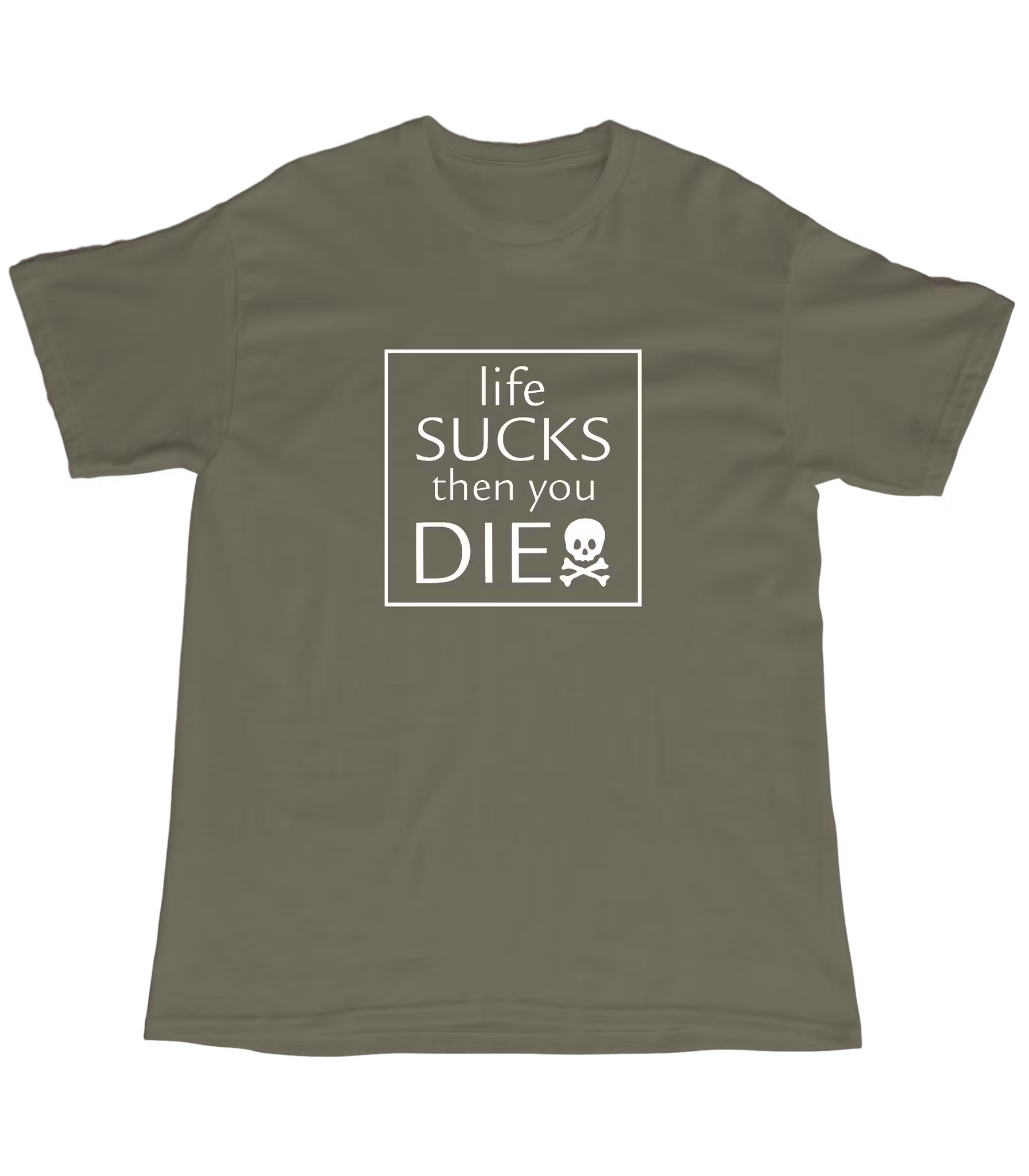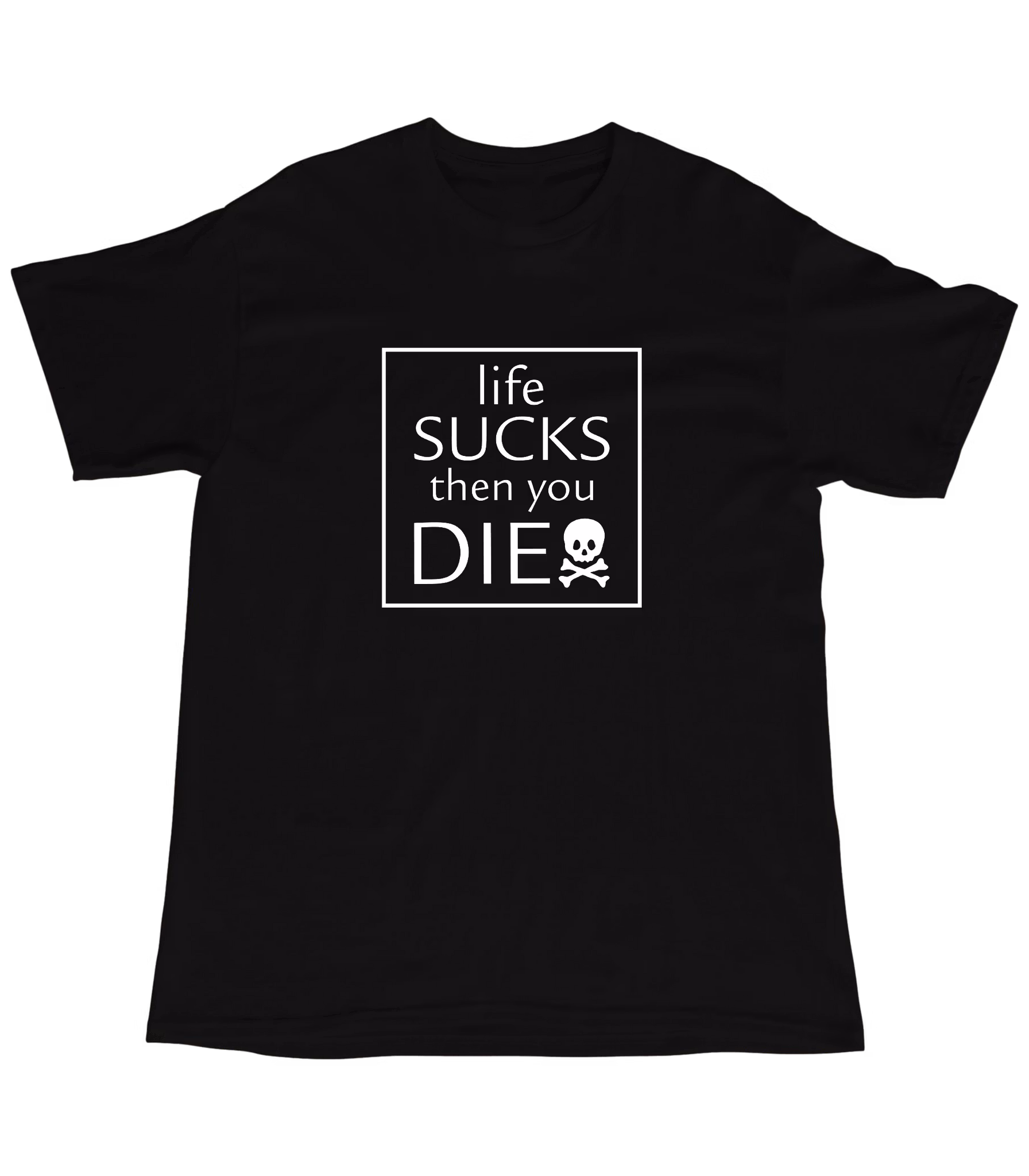 När livet känns som en konstant rad av små besvikelser – varför inte bära det med stolthet? Den här t-shirten med trycket 'Life sucks, then you die' är en perfekt påminnelse om att ta eländet med en klackspark. Gjord av 100% bomull, så du kan vara bekväm medan du surar över vuxenlivet, missade bussar och att chipsen alltid tar slut för snabbt. Perfekt för alla som föredrar cynisk humor över peppiga livsmotton!