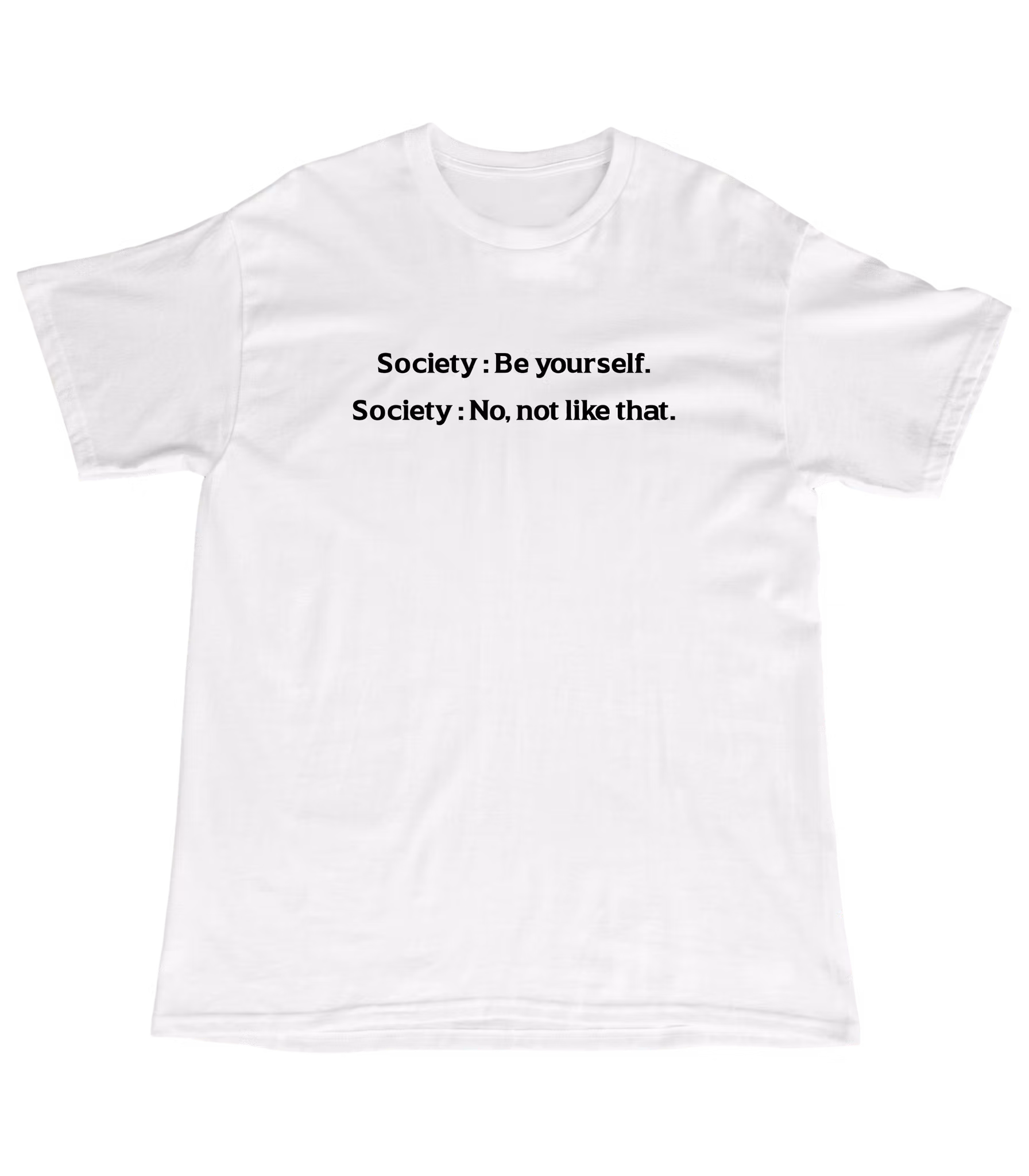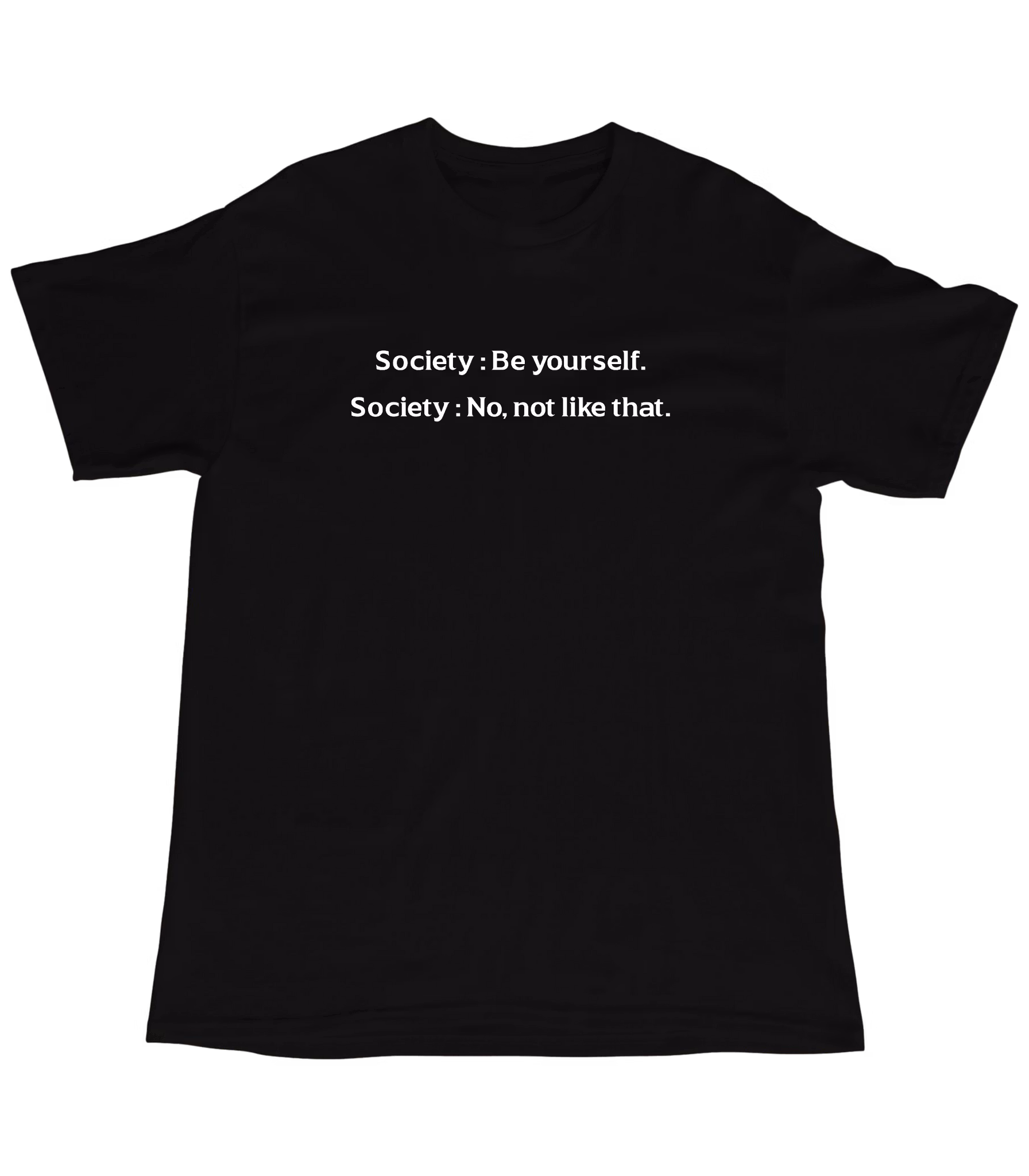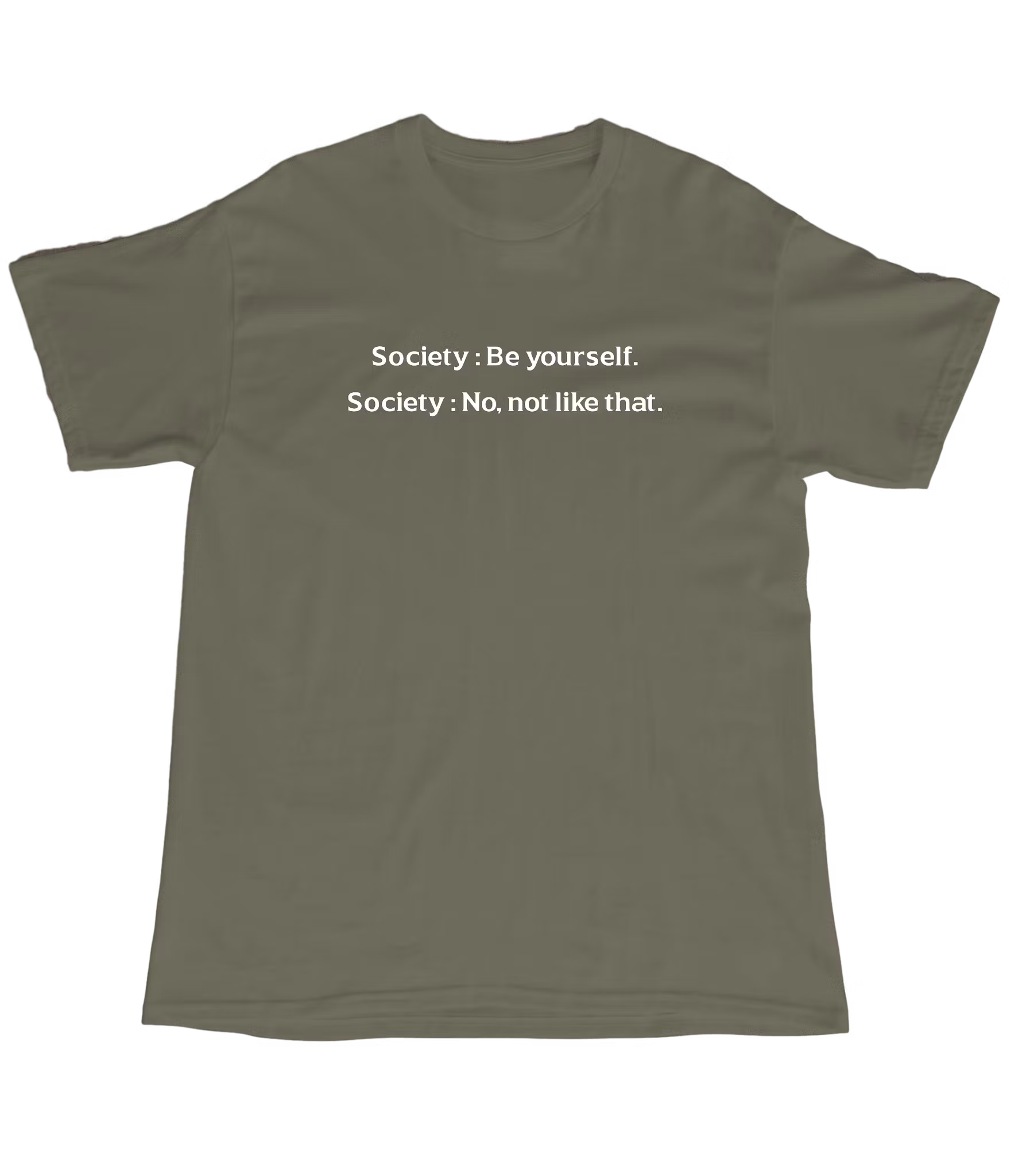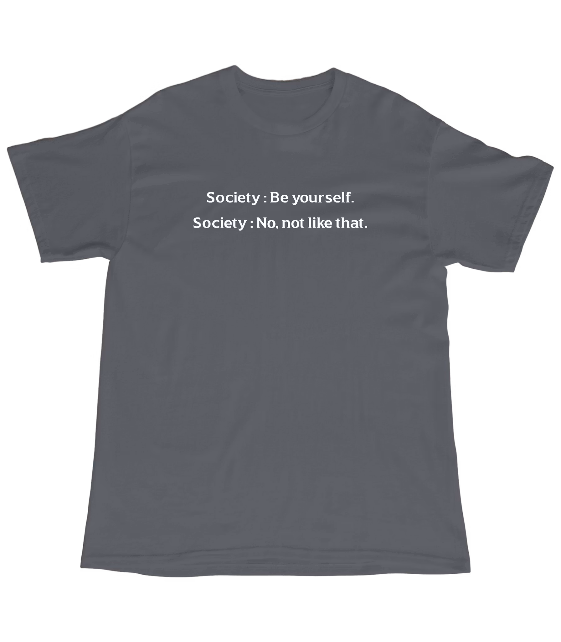 Dubbelmoralen är verklig! Den här t-shirten med trycket 'Society: Be yourself. Society: No, not like that' fångar den eviga kampen mellan att vara sig själv och att försöka passa in. Perfekt för dig som har känt av samhällets motsägelsefulla råd och hanterar det med en stor dos humor och självdistans. Gjord av 100% bomull, så du kan vara bekväm medan du fortsätter att vara exakt den du vill – på ditt eget sätt!